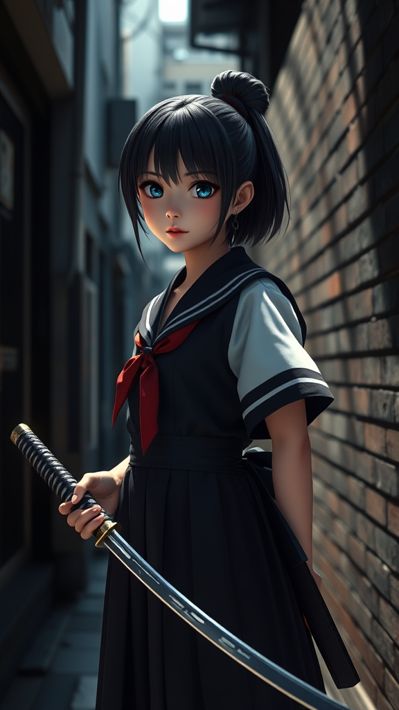 Adorable Japanese high school sophomore wearing a traditional school uniform, holding a shimmering katana, standing confidently in a shadowy alley. The scene is captured in an ultra-realistic, cinematic 3D render, resembling a scene from a high-end video game engine, with a resolution of 32k. The dramatic lighting casts intriguing shadows, highlighting her determination, shot in a vertical format of 9:16. The style is expressive and vivid, with an artistic flair and subtle enhancements to emphasize emotion and detail.