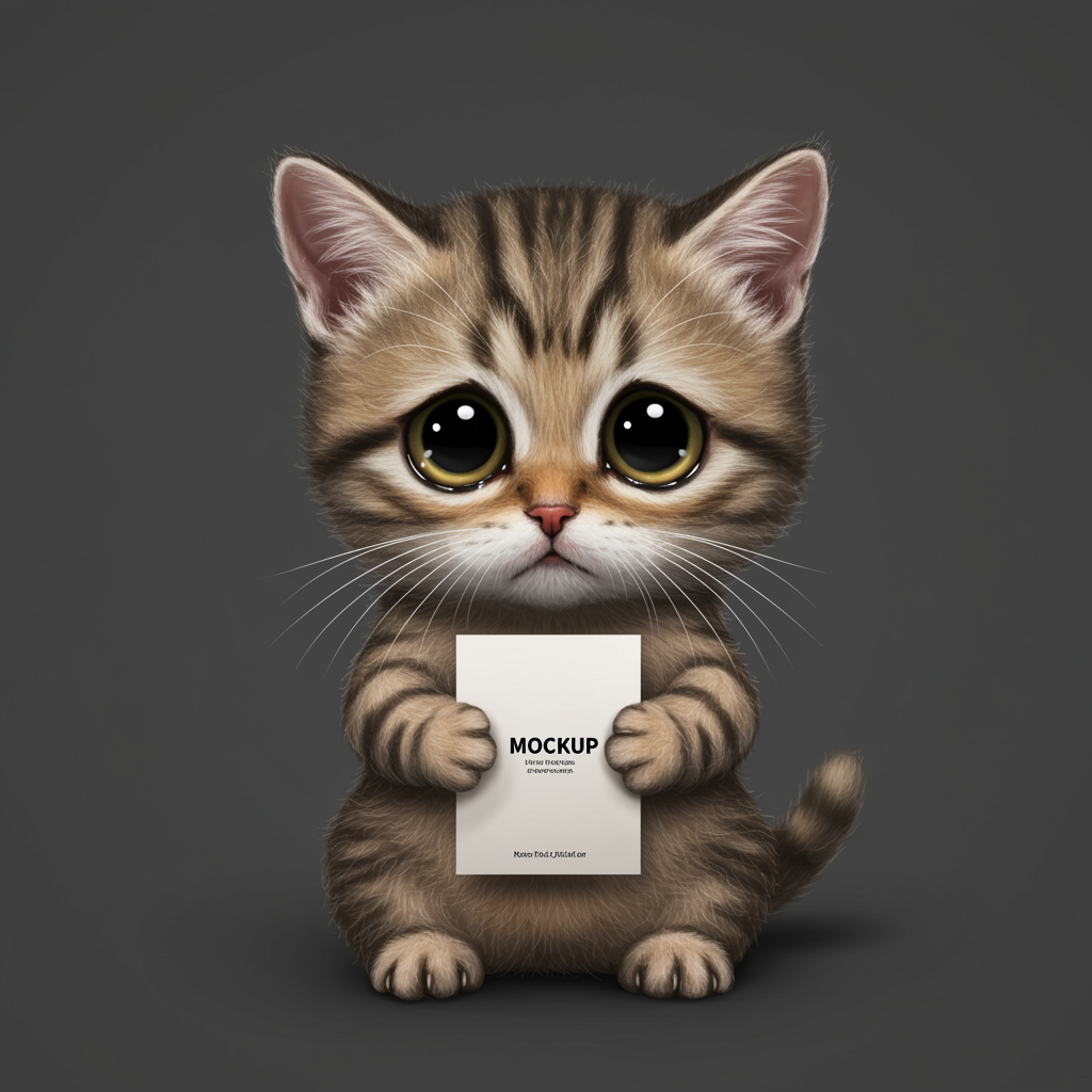 Adorable kitten with oversized, sorrowful eyes, clutching a flat lay mockup set against a simple backdrop. Employing flatlay photography style, with clean minimalist design and studio-quality lighting, captured from an overhead angle. Features hyper-realistic details in a chibi-like depiction, optimized for maximum detail.