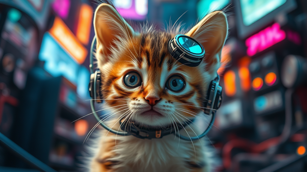 Adorable kitten with a blend of curiosity and futuristic features, enhanced with cyborg elements in a vividly detailed cyberpunk setting, showcasing high dynamic range effects, captured in a cinematic shot with soft vignette.
