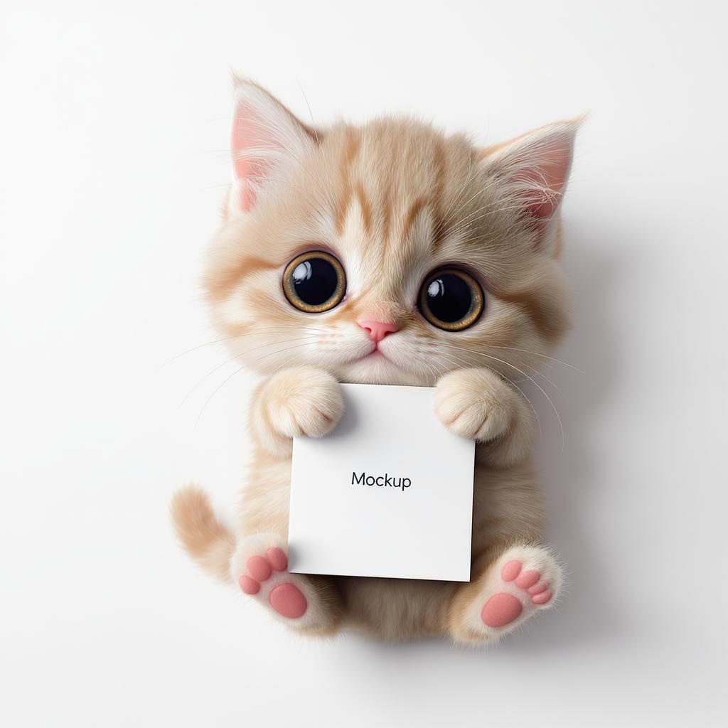 Adorable kitten with enormous, soulful eyes, clutching a mockup template, set against a minimalist backdrop; styled in flatlay photography with expert studio lighting, captured from an overhead perspective. The scene is hyper-realistic, featuring a chibi-style animal with enhanced detailing for maximum cuteness.