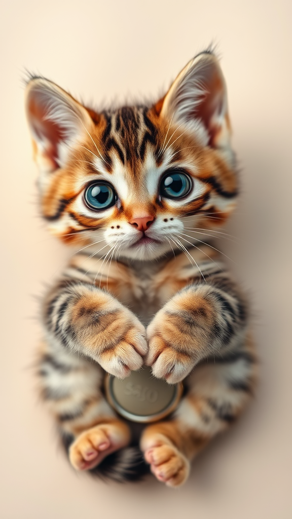 Adorable kitten with large, soulful eyes, clutching a flat lay mockup, set against a soft, minimalistic background. Captured in flatlay photography style with professional studio lighting, this overhead shot highlights the hyper-realistic, chibi animal features, complete with detail-enhancing elements.