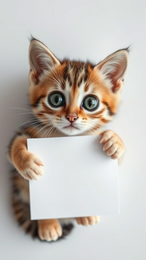 Adorable kitten with large, soulful eyes, tenderly clutching a flat lay mockup, set against a minimalist backdrop, captured in flatlay photography style with expert studio lighting, showcasing an overhead view, hyper-realistic portrayal, chibi-inspired design, enhanced for maximum detail.