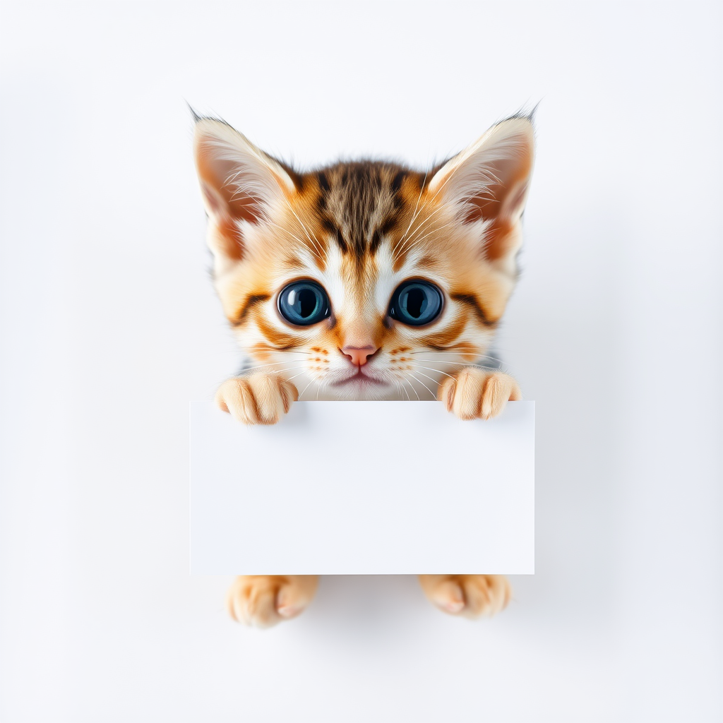 Adorable kitten with oversized, expressive eyes clutching a flat lay mockup, set against a simple background, captured in flatlay photography style, minimalist design with professional studio lighting, overhead perspective for a hyper-realistic, chibi-inspired look focusing on enhanced details.