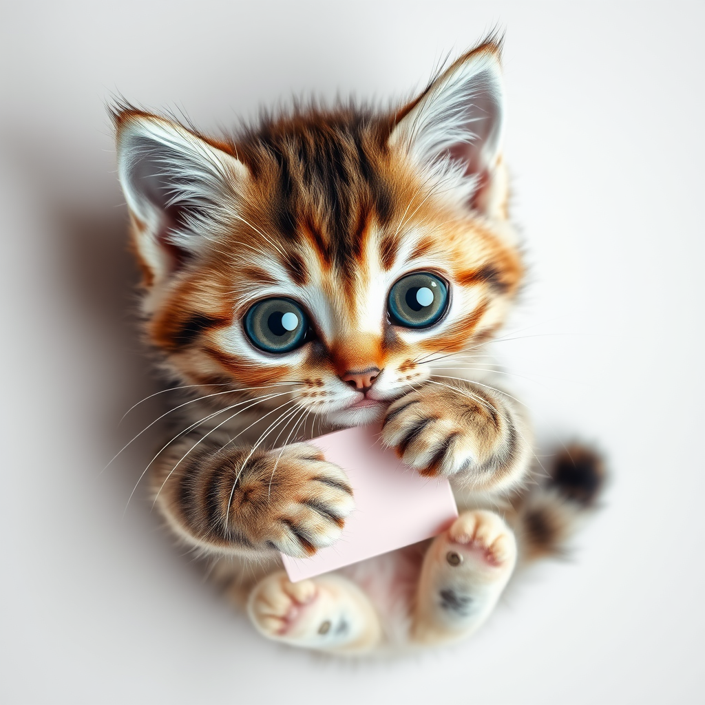 Adorable kitten with oversized, glistening eyes, conveying a sense of innocence, gently clutching a flat lay mockup of a design, set against a simple, aesthetically pleasing background, captured in a flat lay photography style. The scene is lit with expert studio lighting, emphasizing the hyper-realistic, chibi animal features. Photographed from an overhead angle, every detail is maximized to highlight the kitten’s endearing presence.