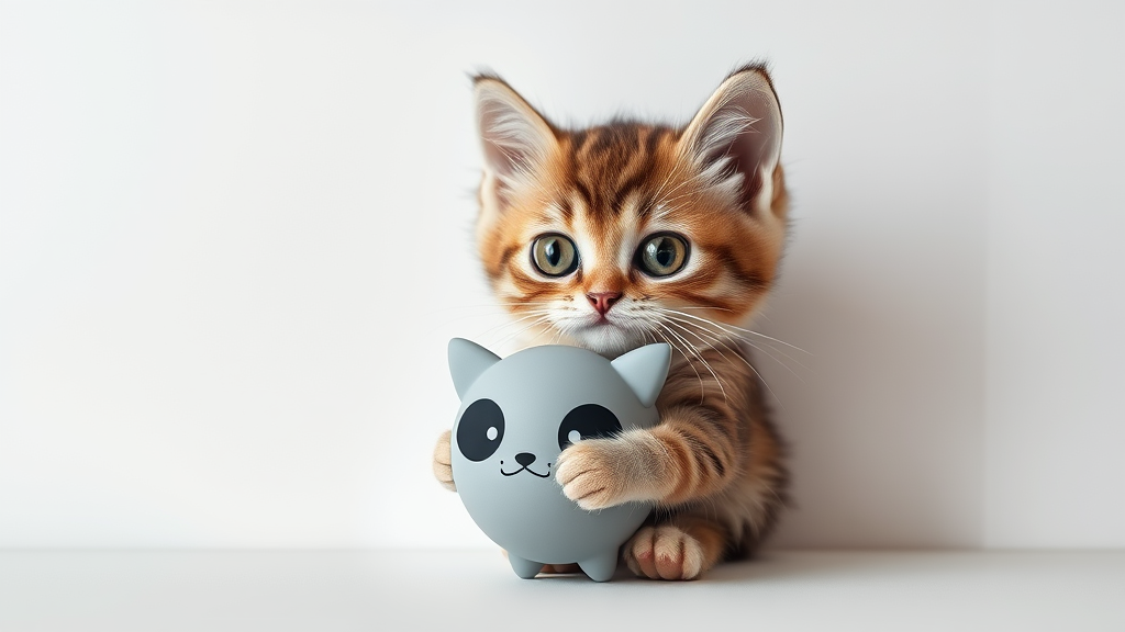 Adorable kitten with oversized, melancholy eyes, clutching a flat lay design prototype, placed against a minimalist backdrop, embodying flat lay photography aesthetics, with expert studio lighting from above, showcasing a hyper-realistic chibi creature, enhanced with maximum detail.