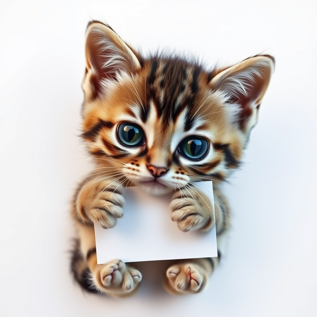 Adorable kitten with oversized, melancholy eyes, clutching a flat lay mockup design, set against a simple backdrop, photographed in flatlay style with clean, minimalistic aesthetics, using professional studio lighting from an overhead perspective, hyper-realistic chibi animal with enhanced details.