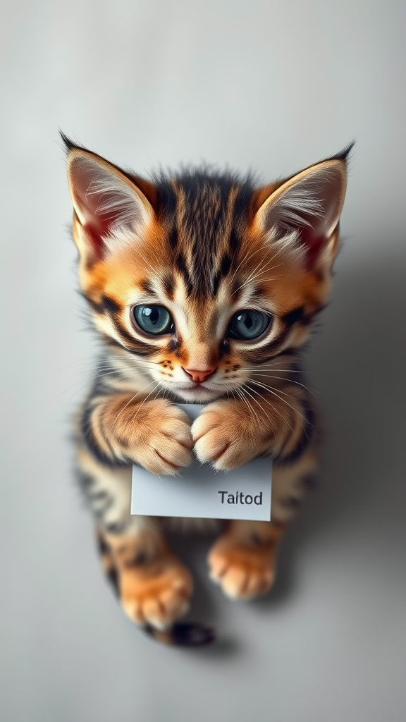 Adorable kitten with oversized, melancholy eyes, clutching a flat lay mockup, set against a sleek background in flat lay photography style, minimalist design, expertly lit with professional studio lighting, captured in an overhead shot from above, hyper-realistic with chibi features, detail-focused.