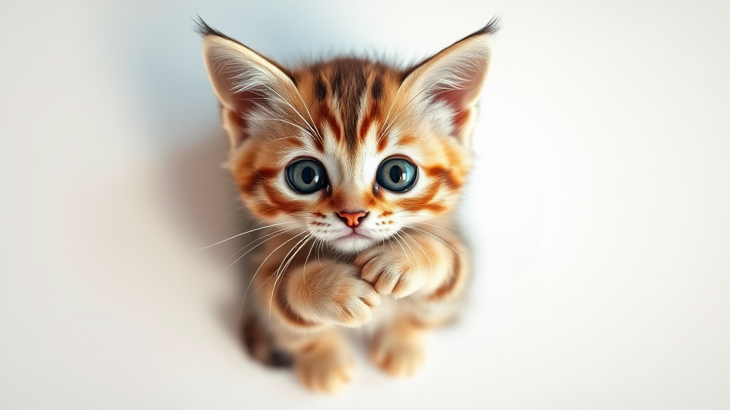 Adorable kitten with oversized, soulful eyes, clutching a flat lay mockup, set against a simple background, captured in flatlay photography style. Minimalist design with expert studio lighting, showcasing an overhead perspective, hyper-realistic chibi animal in detail-rich maximization.