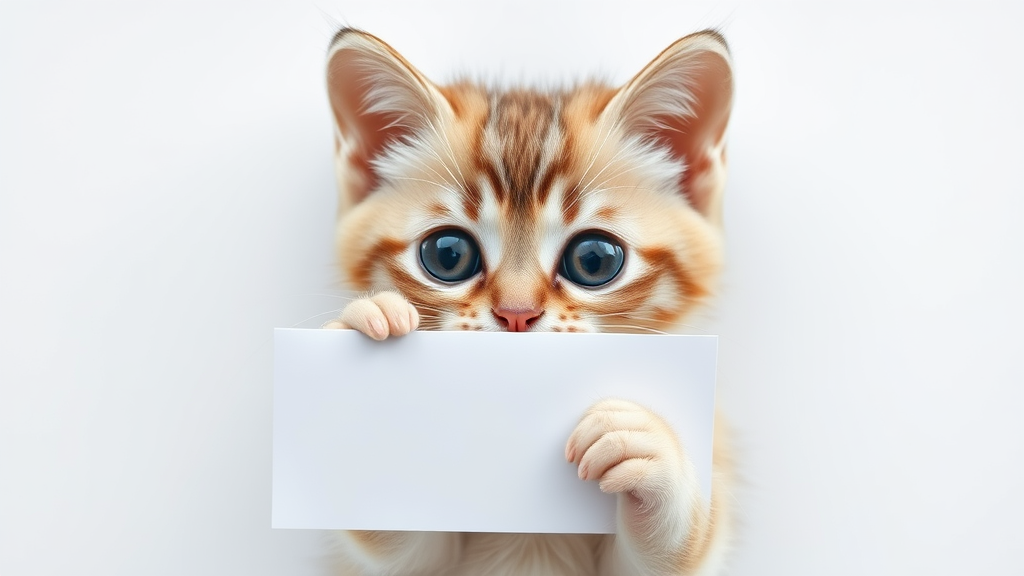 Adorable kitten with oversized, soulful eyes clutching a flat lay mockup against a simple background; minimalist flatlay photography style with expertly crafted studio lighting, captured from an overhead perspective, hyper-realistic details highlighted, chibi-style animal with enhanced features for maximum cuteness.