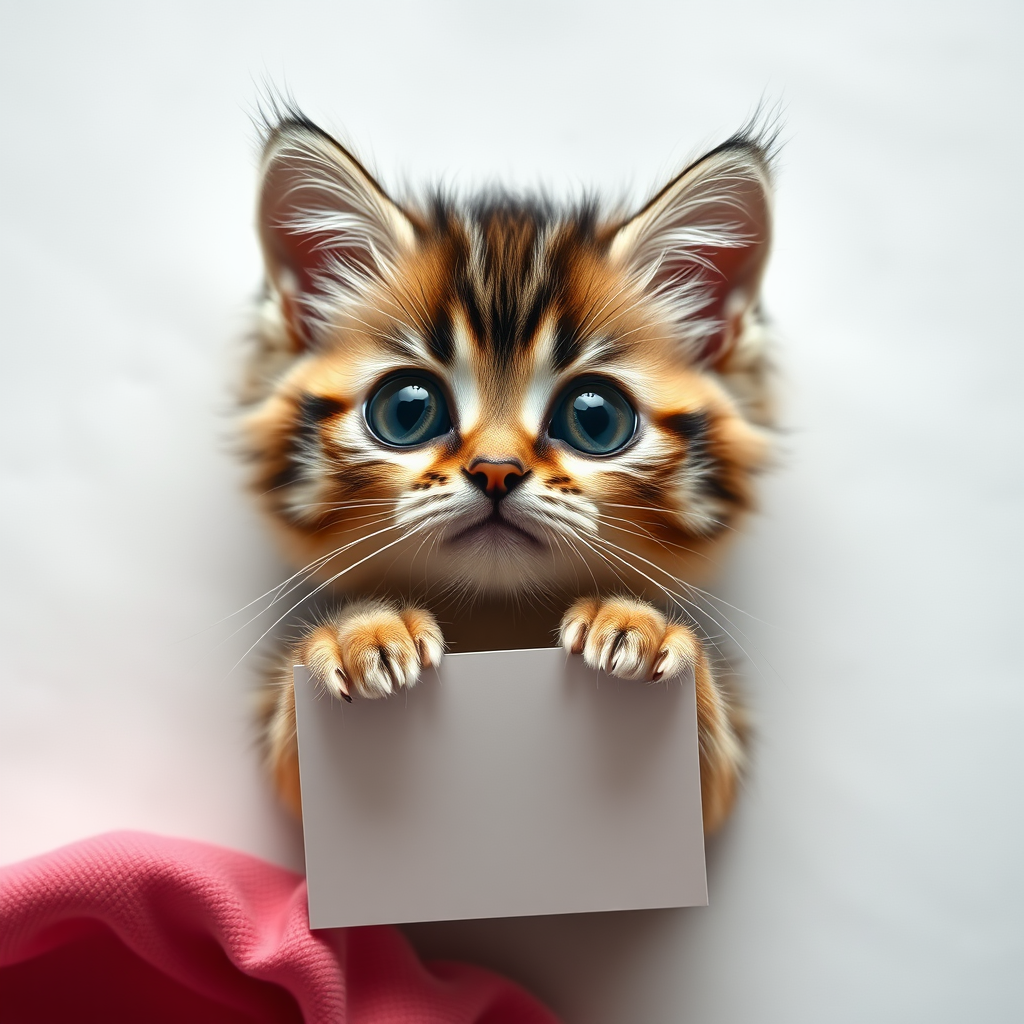 Adorable kitten with oversized, soulful eyes, gently clutching a flat lay mockup, set against a minimalist backdrop, employing flatlay photography techniques, refined studio lighting, and an overhead perspective, hyper-realistic chibi-style, with enhanced detail emphasis.