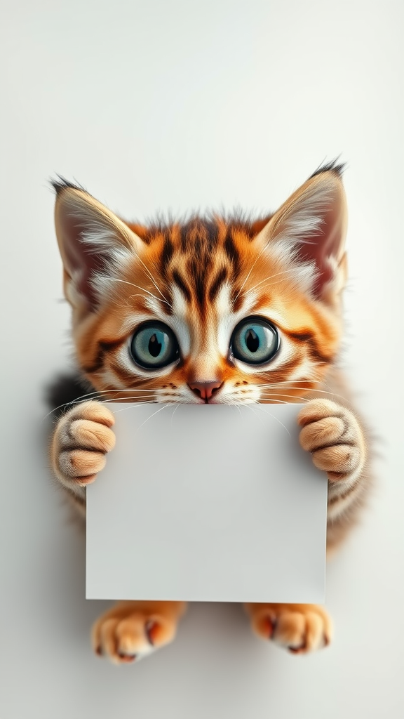 Adorable kitten with oversized, soulful eyes holding a flat lay mockup, set against a minimalistic backdrop, captured in flatlay photography style with professional studio lighting. The scene is an overhead shot highlighting hyper-realistic details, featuring a chibi-style animal design with maxed-out detail, creating an endearing and visually captivating composition.