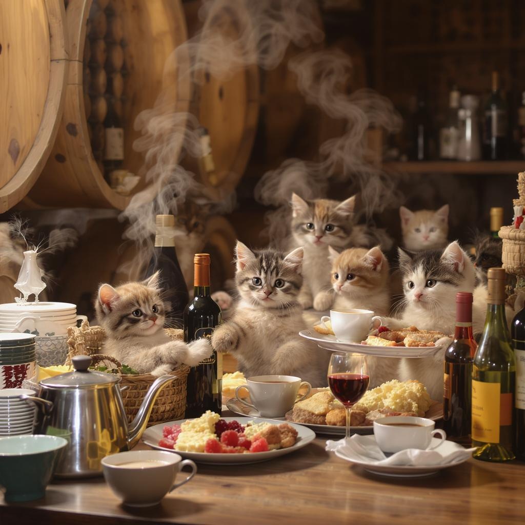 Adorable kittens busily prepare a delightful variety of beverages; some are carefully brewing aromatic teas, while others craft rich, steaming coffees and velvety chocolates. These nimble felines scurry to and from the kitchen, balancing trays overflowing with delicious meals and treats. In the cozy ambiance of a wine cellar, a few kittens expertly select bottles of fine wines, their tiny paws handling each with surprising dexterity, bringing a whimsical charm to these culinary endeavors.