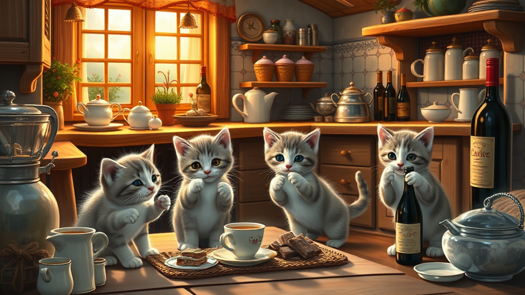 Adorable kittens bustling about a cozy cottage, skillfully preparing tea, brewing aromatic coffee, and melting rich chocolate. They scamper to and fro, bringing delightful meals from the quaint kitchen, while others nimbly descend into the cellar to retrieve fine bottles of wine, their tiny paws carrying everything with charming precision.