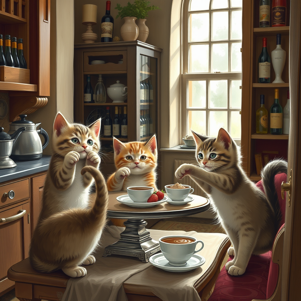 Adorable kittens bustling about as they expertly brew tea, coffee, and hot chocolate, gracefully retrieving meals from the kitchen and selecting fine wines from the cellar, all with an air of delightful mischief and charm.