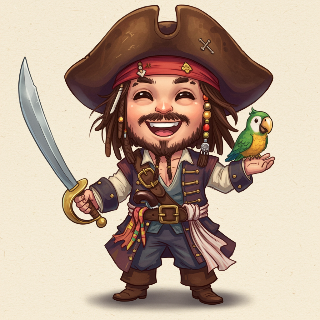 Adorable mini Jack Sparrow, cartoonish pirate with oversized hat and cheeky grin, tiny sword in hand, playful expression, vibrant pirate attire with colorful sashes and trinkets, small parrot companion perched on shoulder, mischief in his eyes, whimsical and fun seafaring scene.