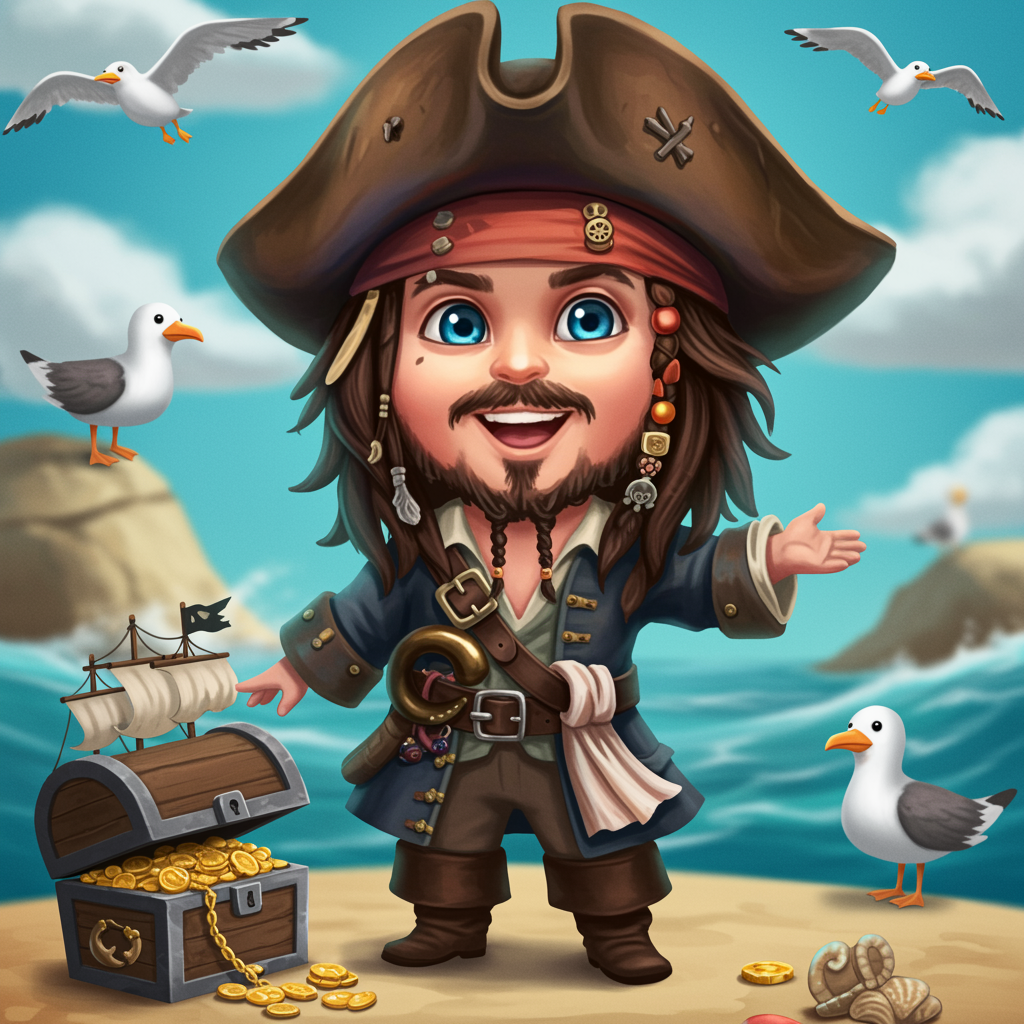 Adorable mini pirate Jack Sparrow, cartoonish with oversized hat and braided beard, playful expression, vibrant colors, surrounded by tiny pirate ship and treasure chest, comical seagulls in the background, whimsical sea adventure ambiance.