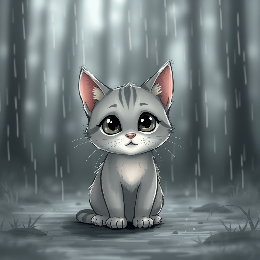Adorable miniature cat in a misty forest setting, rain lightly falling, character-focused portrait style, tilt-shift effect, bokeh background, monochrome tone, intentionally awkward drawing style, distorted anatomy, subtly misplaced features, quirky charm with an extra paw, playfully missing an ear.
