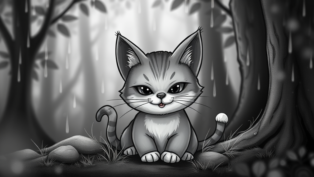 Adorable miniature cat with a mischievous grin nestled within a misty forest, raindrops glistening around, styled as a whimsical character portrait with a tilt-shift focus. The scene is rendered in black and white with an exaggerated use of bokeh, featuring intentionally quirky drawing errors like playful anatomy with an extra tail and a missing paw.