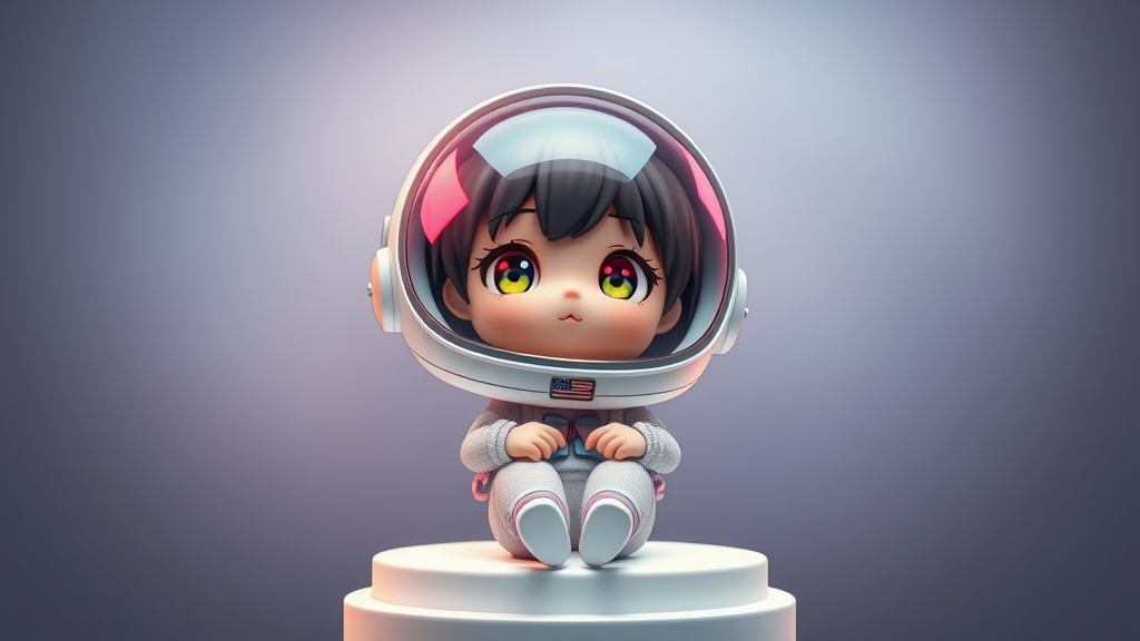 Adorable miniature figurine of a young girl in a charming space helmet, beautifully rendered in 3d with intricate details, showcasing a female adventurer in a whimsical cute style. The digital painting portrays a stylized 3d representation of a cute anime girl astronaut, her eyes gleaming as she gazes upwards, sitting gracefully on a white pedestal. This portrait captures the essence of a youthful and inquisitive space cadet, emphasizing her charm and adventurous spirit.