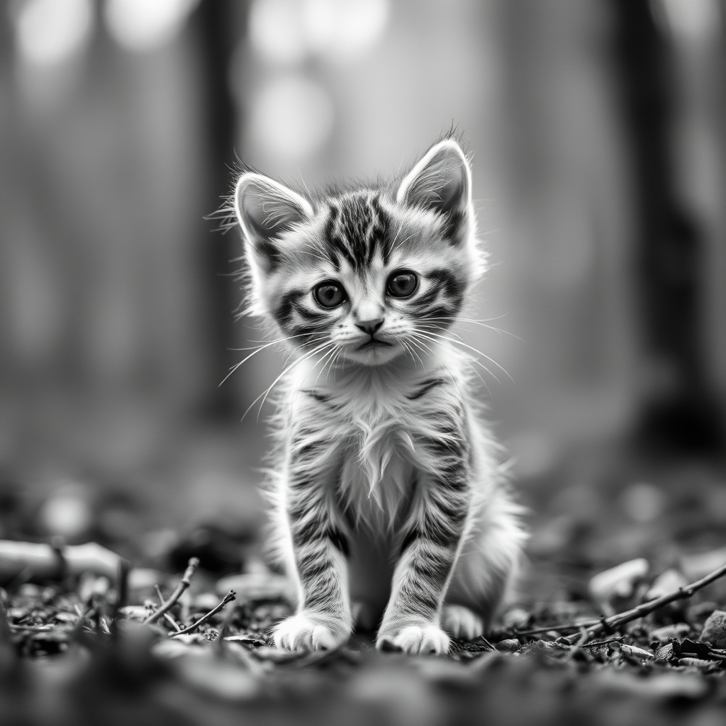 Adorable miniature kitten in a forest setting during a drizzle, depicted as a character portrait with a tilt-shift effect; bokeh backdrop in grayscale, intentionally flawed with incorrect anatomy, featuring misplaced or extra limbs and some limbs missing.