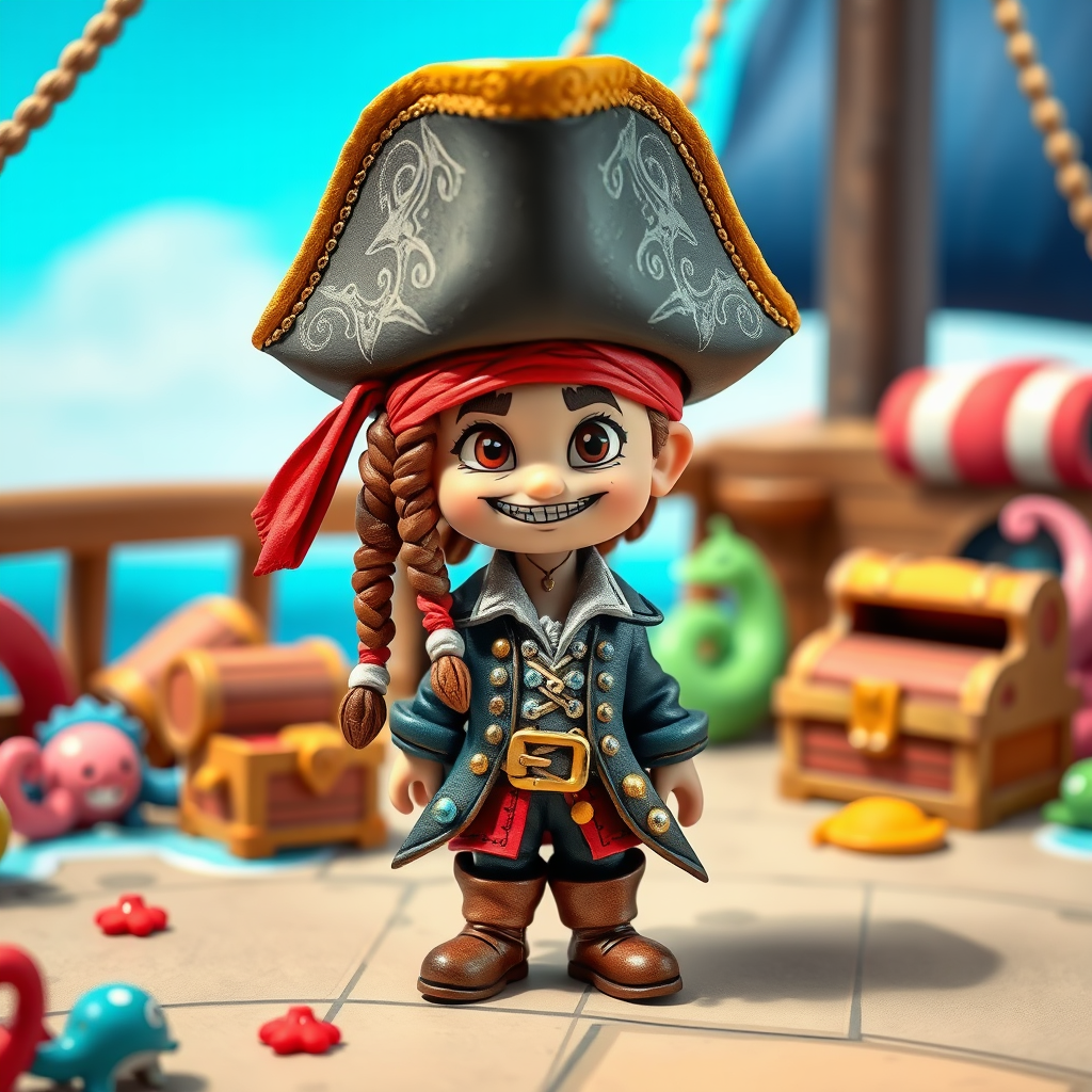 Adorable miniature pirate captain, reminiscent of Jack Sparrow, with oversized hat and beaded braids, playfully mischievous expression, intricate pirate attire with tiny boots and a richly detailed coat, standing on a cartoonish ship deck, surrounded by whimsical sea creatures and treasure chests, vibrant and colorful scene, evoking a sense of adventurous fun.