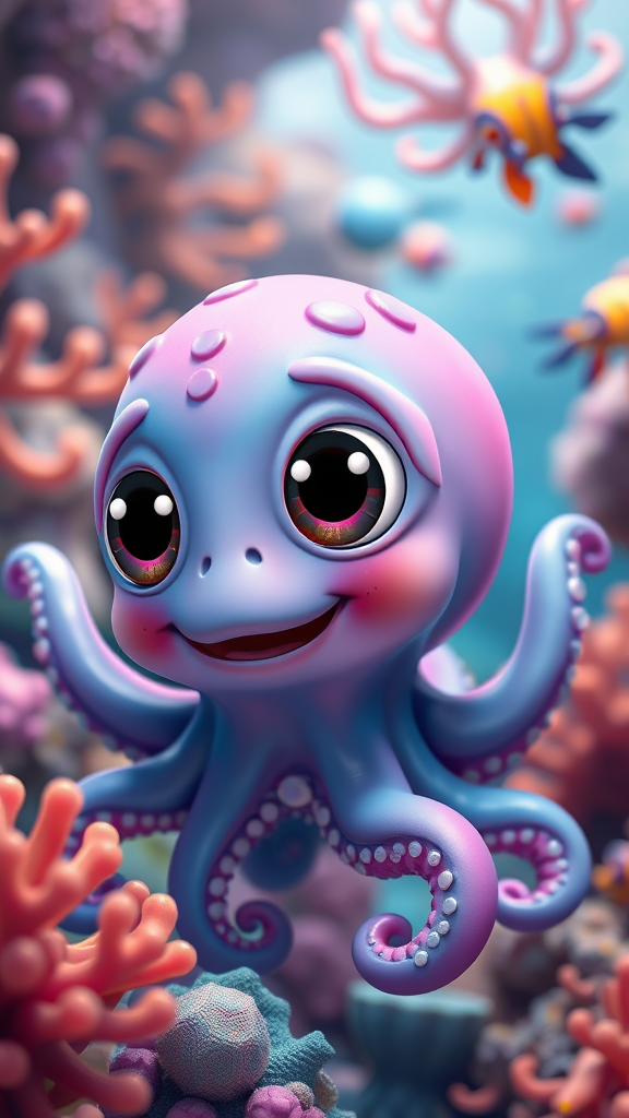 Adorable Pixar-esque baby octopus with exaggerated large eyes and a cheerful expression, showcasing a vibrant and whimsical palette that highlights its playfulness, surrounded by a watery wonderland of colorful coral and friendly sea creatures, evoking an aura of irresistible cuteness and charm.
