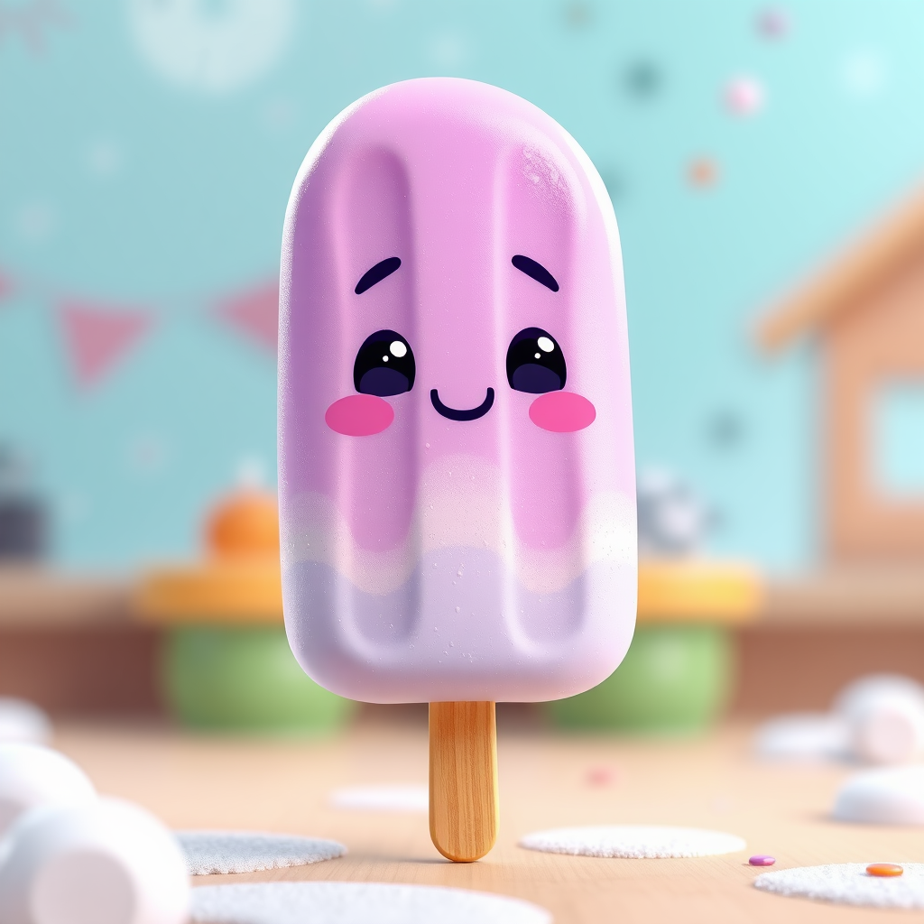 Adorable popsicle character from a mobile game, ultra-realistic, octane render, 5k resolution, cartoonish style, pastel purple with a playful expression, slight ice shimmer, subtle hand-drawn elements, whimsical background.