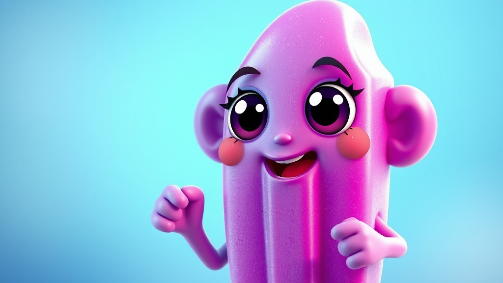 Adorable popsicle character from a mobile game, ultra-realistic, rendered in octane, 5k resolution, toon style, vibrant shades of purple with slight glimmers of iridescent sheen, whimsical expression with oversized cartoon eyes, subtle frost texture, playful and dynamic pose with a touch of fantasy charm.
