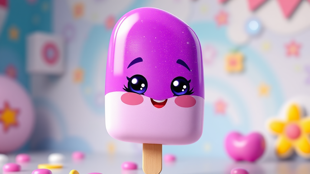 Adorable popsicle character from a mobile game, ultra-realistic, rendered with Octane in 5k resolution, cartoon style with vibrant purple hues, featuring sparkling eyes and a playful expression, set against a whimsical, colorful backdrop with a touch of glossy texture.
