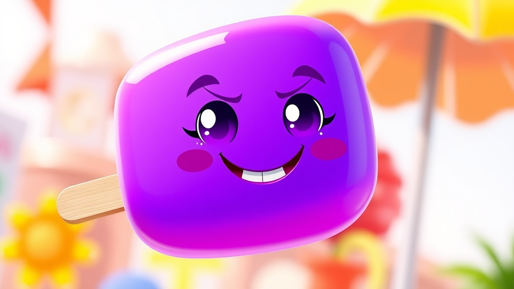 Adorable purple popsicle character from a mobile game, highly realistic, rendered in Octane, 5k resolution, with a playful toon style, featuring a glossy finish, sparkling eyes, and a mischievous smile, exuding a charming and whimsical personality, set against a colorful, sunny backdrop that enhances its vibrant hues.