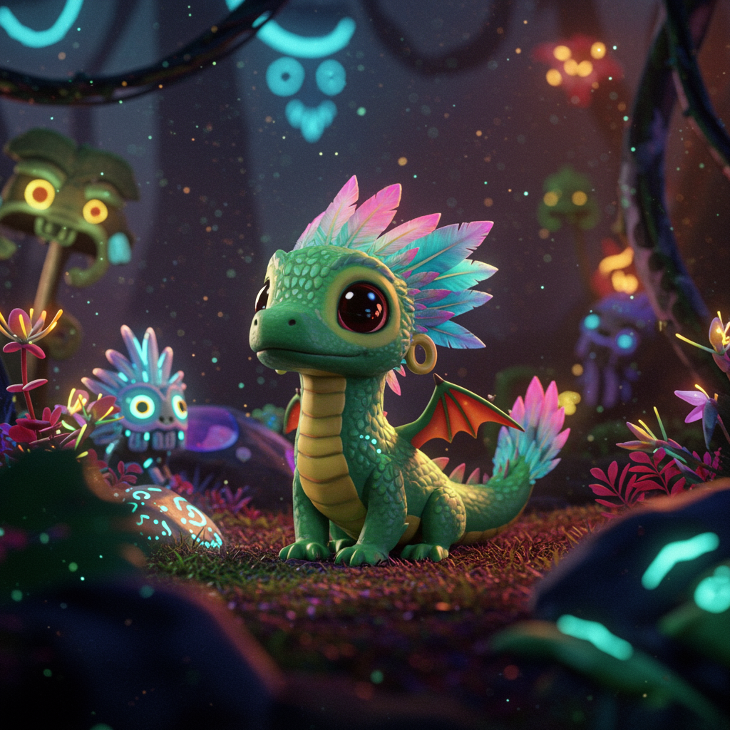 Adorable Quetzalcoatl, a small, feathered dragon with charming eyes, nestled in a bioluminescent jungle teeming with mythical creatures and vibrant life. Envision a fantastical world enriched with intricate details and a soft neon diffuse glow. The scene bursts with iridescent colors, paying homage to Aztec civilization, in a breathtaking octane render. The landscape is alive with subtle creative touches, maintaining the essence of enchantment and wonder.