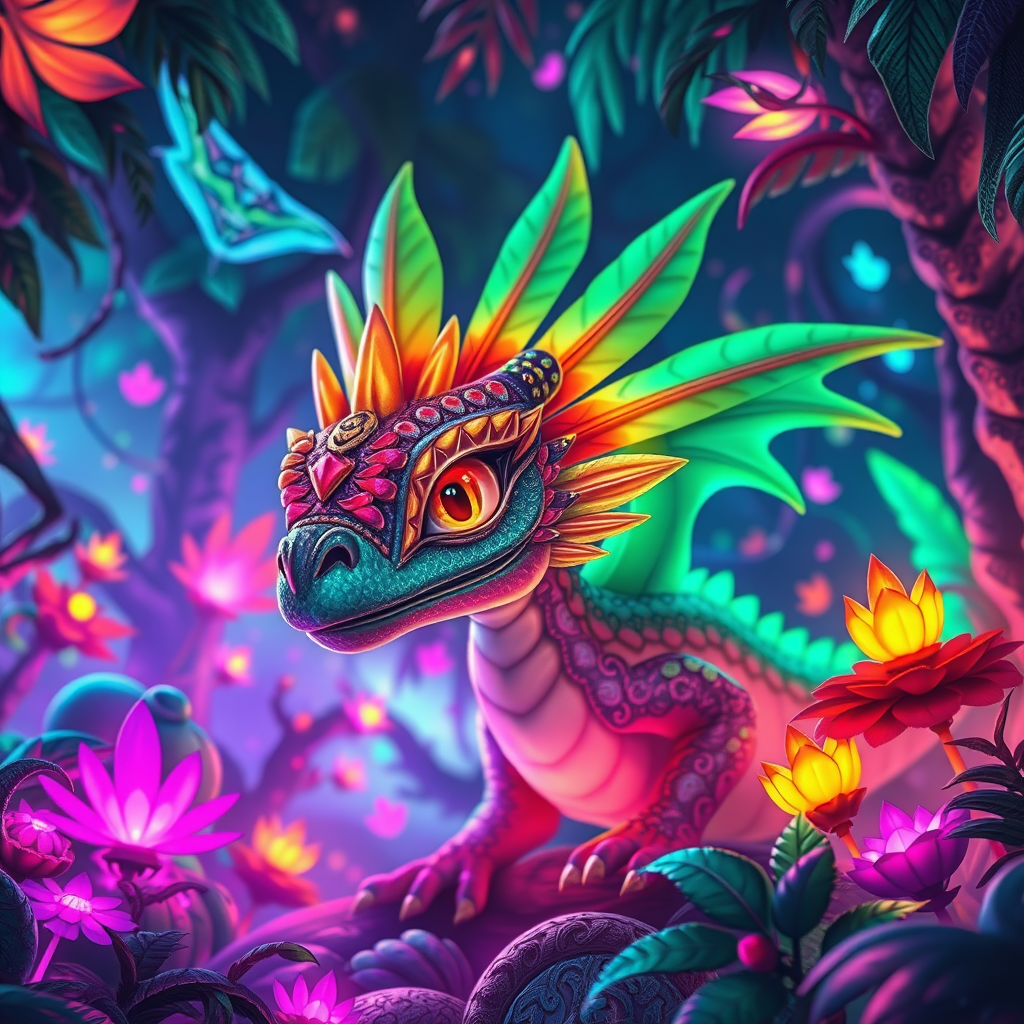 Adorable Quetzalcoatl-inspired feathered dragon with charming eyes in a bio-luminescent jungle teeming with fantasy creatures and vibrant life forms. Set in a fantastical realm, the scene is rich with intricate details, enveloped in a soft neon diffuse glow. The colors are iridescent, reminiscent of Aztec civilization artifacts. The environment is breathtakingly rendered with stunning octane-like quality, bringing the mystical world to life.