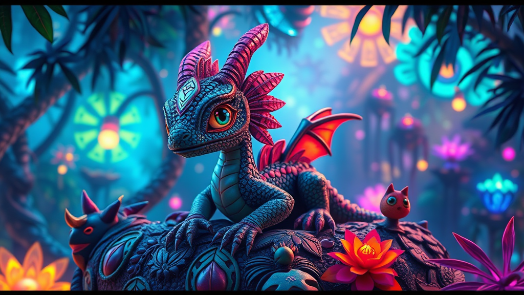 Adorable Quetzalcoatl-inspired small feathered dragon with charming eyes, nestled in a bioluminescent jungle teeming with whimsical creatures and vibrant life. Fantastical realm with intricate, detailed scenes bathed in a neon diffuse glow. Iridescent hues dance across this world, evoking the magnificence of the Aztec civilization. Captivating octane render with subtle imaginative twists, bringing the enchanting landscape to life.