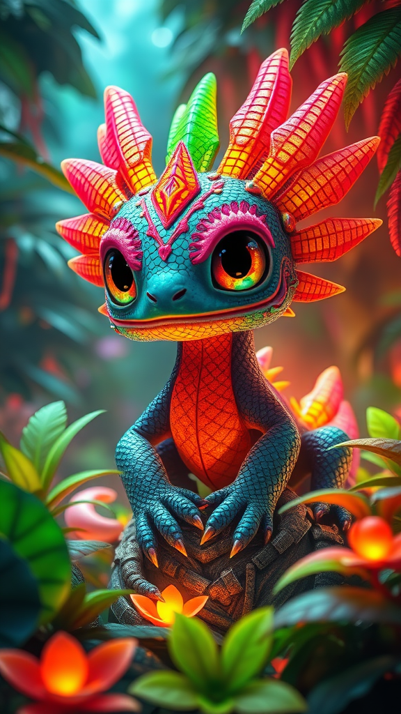 Adorable Quetzalcoatl-inspired small feathered dragon, featuring big cute eyes. Enchanting fantasy creature nestled within a bio-luminescent jungle thriving with diverse life forms and wonder. Vibrant fantastical world with intricate details and a neon diffuse glow effect enveloping the scene. Display of iridescent colors reminiscent of the Aztec civilization. Captivating octane render with a sense of ethereal illumination.