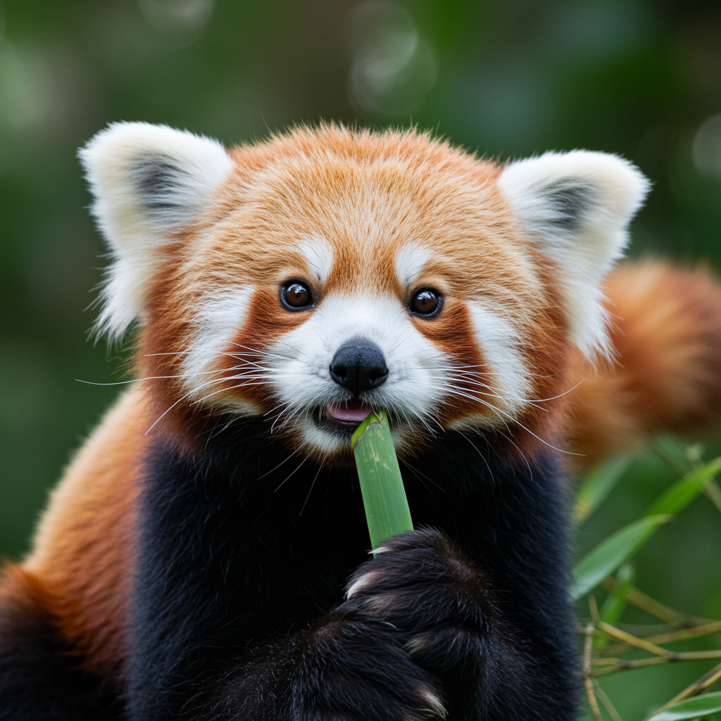 Adorable red panda, charming demeanor, large expressive eyes, rounded ears, gentle face, bushy tail, vibrant colors, playful, munching happily.