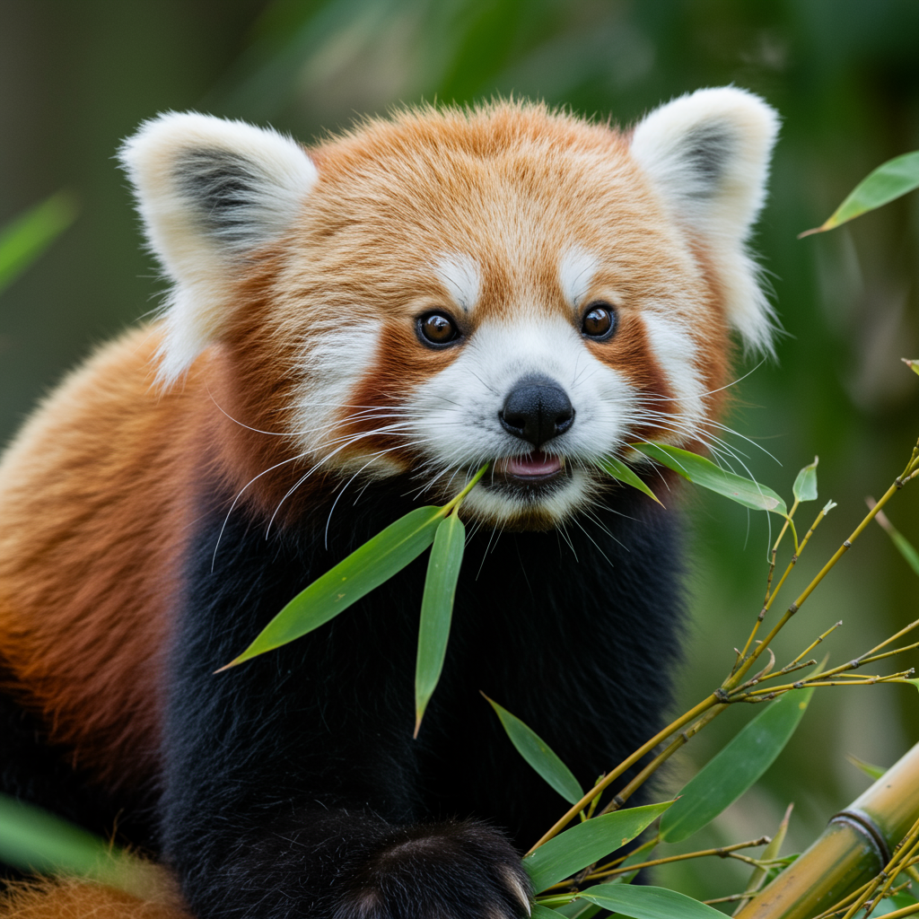 Adorable red panda with a charming demeanor, captivating big eyes, round ears, and a flat face, flaunting a bushy, vivid tail, displaying a playful personality as it munches contentedly.
