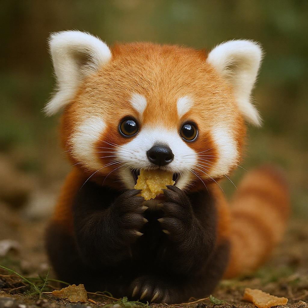Adorable red panda with a charming demeanor, large expressive eyes, rounded ears, a gently curved face, and a bushy tail, vibrant and amusing as it munches playfully.
