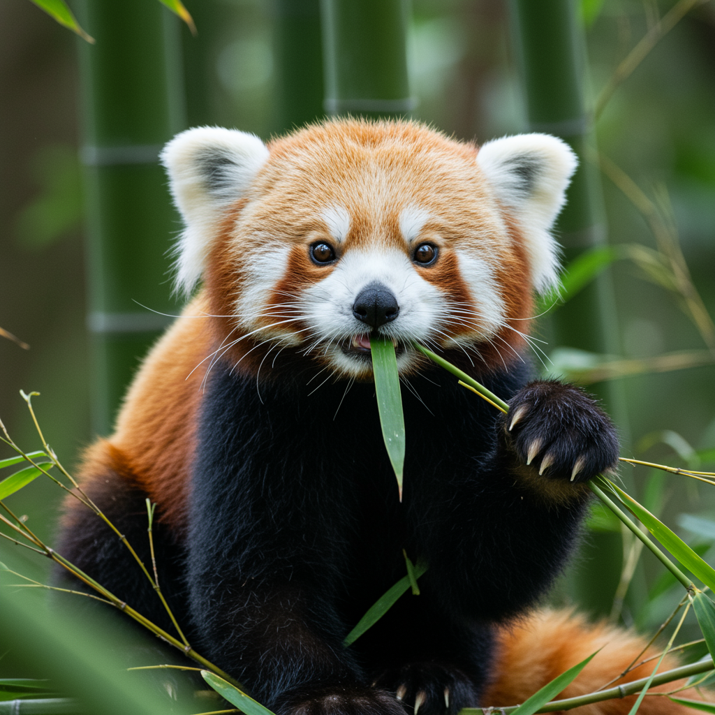 Adorable red panda with a charming demeanor, strikingly large eyes, circular ears, a broad face, and a bushy tail, exuding a lively and playful presence while munching away.