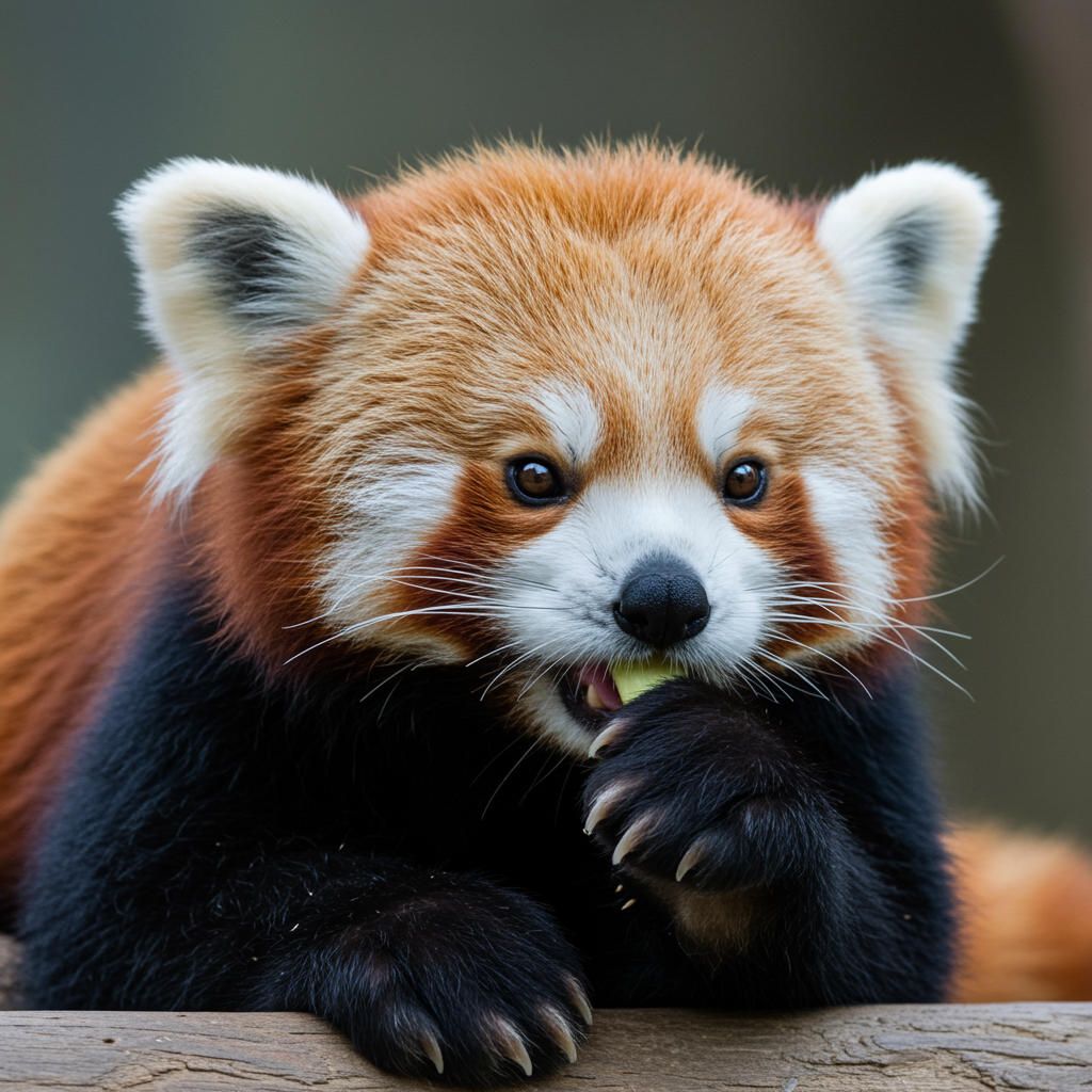 Adorable red panda with a gentle demeanor, large expressive eyes, rounded ears, and a flat face, complemented by a bushy tail, exuding vibrant charm and amusing antics as it munches delightfully.