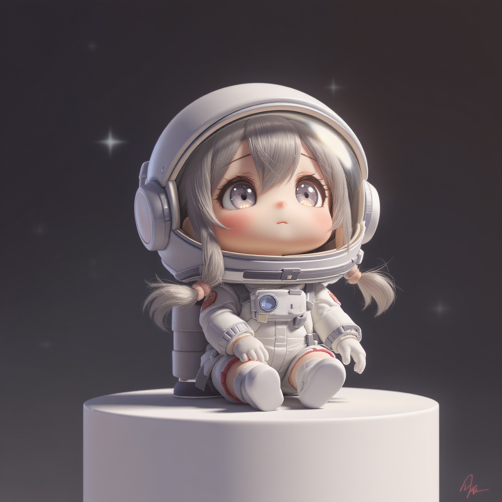 Adorable 3d render of a tiny doll with a helmet, featuring a charmingly detailed digital art style, depicting a female explorer as a mini cute girl. The digital painting showcases a stylized 3d render of a cute anime girl, with the little astronaut gazing upwards in awe. This delightful scene is captured using C4D, with a portrait focus on the anime space cadet girl, who is sitting gracefully on a pristine white pedestal.