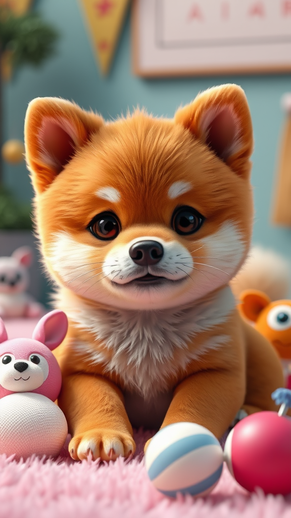 Adorable shiba inu puppy with fluffy fur, rendered in 3D with Fortnite-style elements, showcasing intricate details and studio lighting. The scene features a soft color palette, maximizing cuteness with ultra-fine details. Surrounded by playful props, the puppy exudes a hyper-realistic charm, emphasizing its bright, expressive eyes and endearing expression in a captivating environment.
