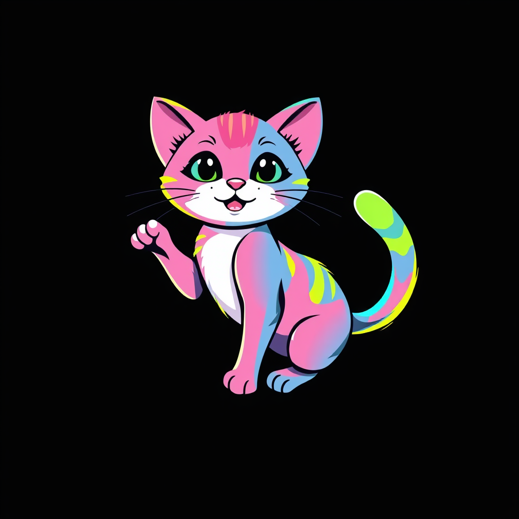 Adorable vector cat illustration for t-shirt design featuring a playful feline character in vibrant pink, blue, yellow, and green hues, set against a sleek black background. Rendered with a crisp and clean aesthetic, the design showcases the cat in a dynamic pose, bringing a sense of fun and whimsy to the composition, creating a striking contrast with the dark backdrop.