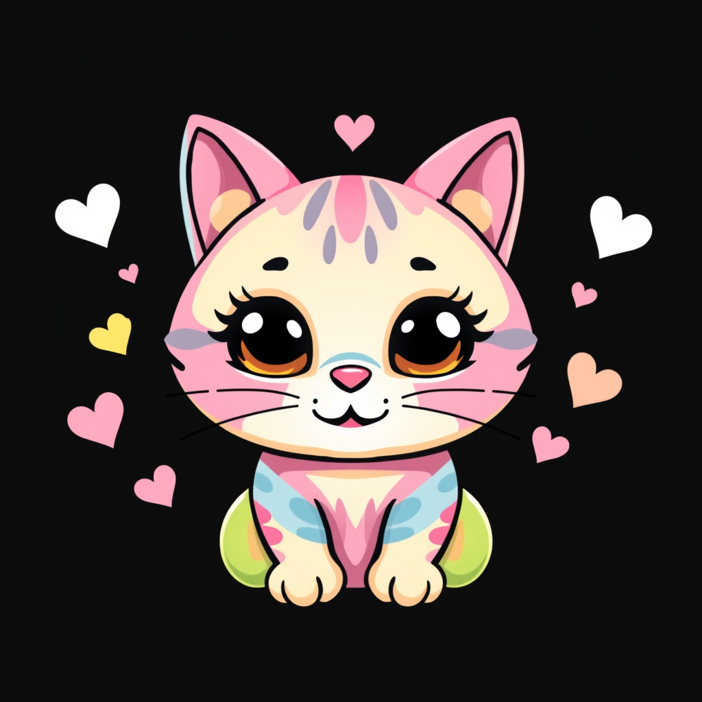 Adorable vector illustration of a cat character designed for a t-shirt, featuring playful pink, blue, yellow, and green hues against a sleek black background, rendered with a glossy finish. The cat has oversized expressive eyes and a whimsical smile, exuding charm and cuteness. The design includes subtle star and heart accents around the cat, enhancing its enchanting appearance while maintaining a clean and vibrant aesthetic.