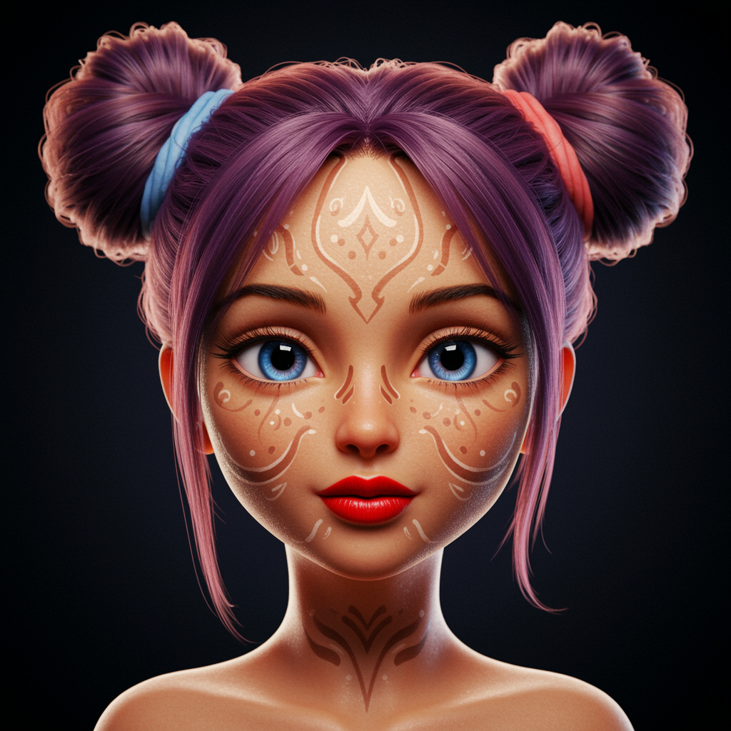 A captivatingly adorable woman with playful top knots exuding vibrant energy, adorned with intricate iridescent patterns and bold red lipstick. Her features exhibit a blend of Pixar-style warmth and Disney's enchanting charm, reminiscent of Artgerm's character art. Her face is intricately detailed, with lifelike, clear eyes that capture attention, rendered in sharp focus. Using octane render and advanced ray tracing, the image boasts ultra-high-definition quality, presenting an 8k, HDR visual spectacle. Her appearance is inspired by a multicultural fusion, subtly influenced by various elements. The scene avoids any artificial distortions or unwanted artifacts, showcasing her in an immersive and visually stunning environment.