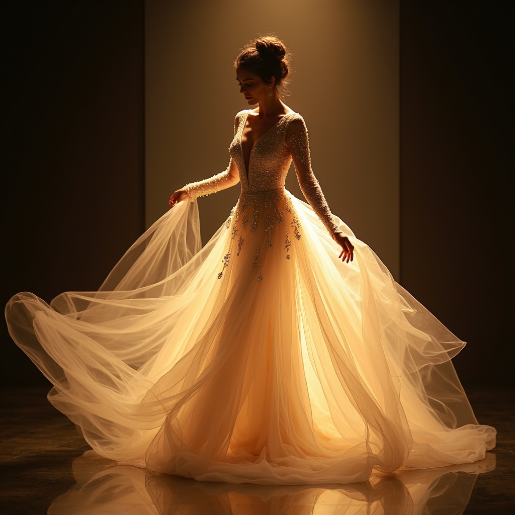 A figure adorned in a radiant gown, shimmering with an ethereal glow as it flows gracefully, capturing the essence of elegance and light, set against a striking vertical backdrop.