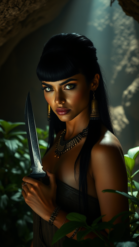 Adult Egyptian woman with striking green eyes and sleek black hair styled in traditional flaps, adorned with subtle yet captivating makeup. She stands in a detailed setting that blends the mystique of ancient Egypt with a feral jungle warrior theme. Her upper body showcased in a dark chamber bathed in dim light, surrounded by lush bushes and poisonous plants. The ambiance is cinematic, resonant of a 1970s film shot on 35mm with high-frequency details and film noise, adding a nostalgic touch. She holds an obsidian stone knife, her fierce gaze locked onto the viewer, exuding strength and wisdom. The air is thick with humidity, enhancing the enigmatic atmosphere of the scene, augmented by the intricacy of OldEgyptAI's influence against a backdrop of rugged rocks and softly focused shadows that suggest hidden depths within the chamber.