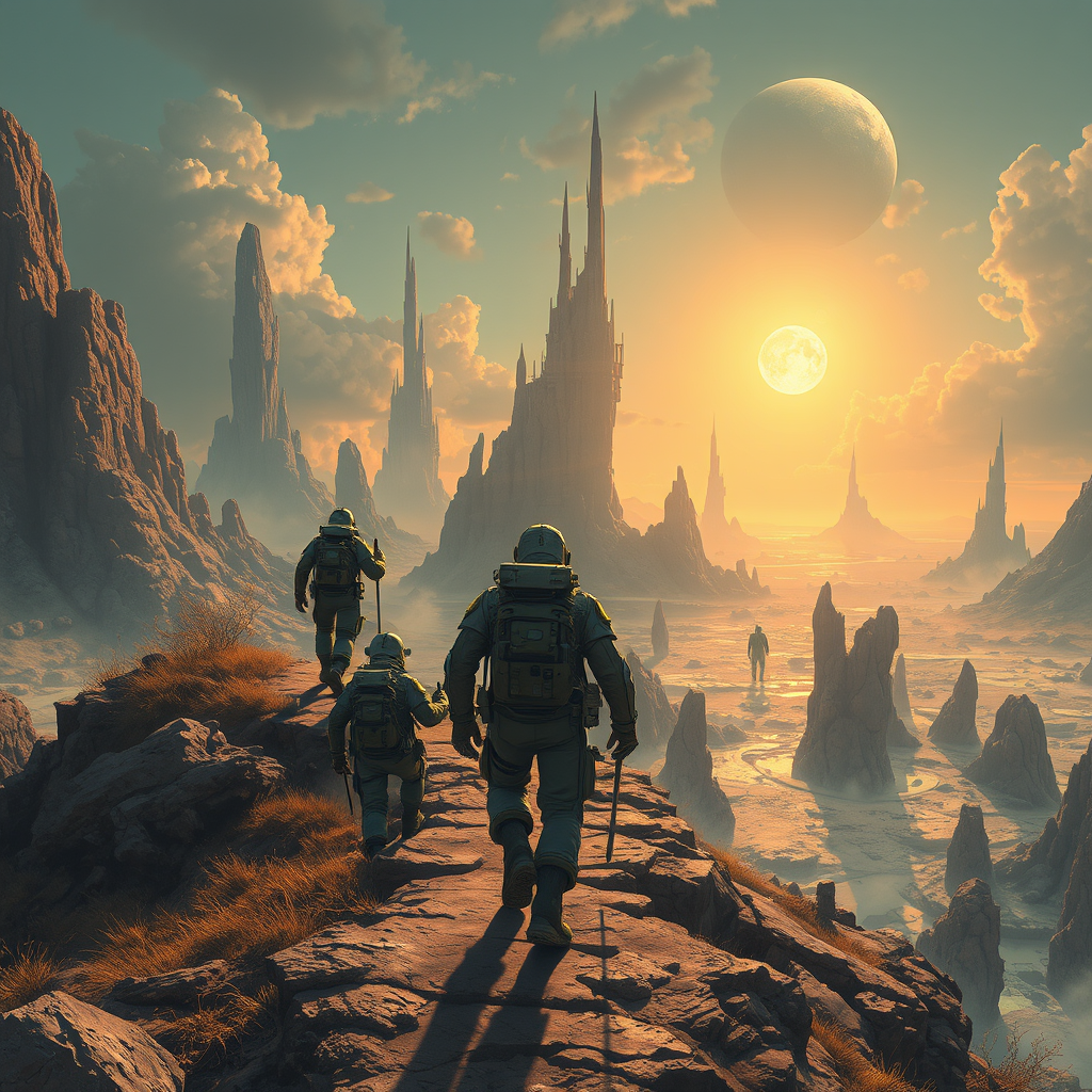 Adventurers traverse an alien landscape, a stunning sci-fi masterpiece with rich atmospheric detail in 4k resolution, trending on artstation. The scene draws influence from the intricate and imaginative styles of Gris Grimly, Richard Anderson, Donato Giancola, Larry Elmore, and Josephine Wall. This otherworldly vista is enhanced by elaborate embellishments and subtle enhancements, capturing the essence of an extraordinary, unfamiliar realm.