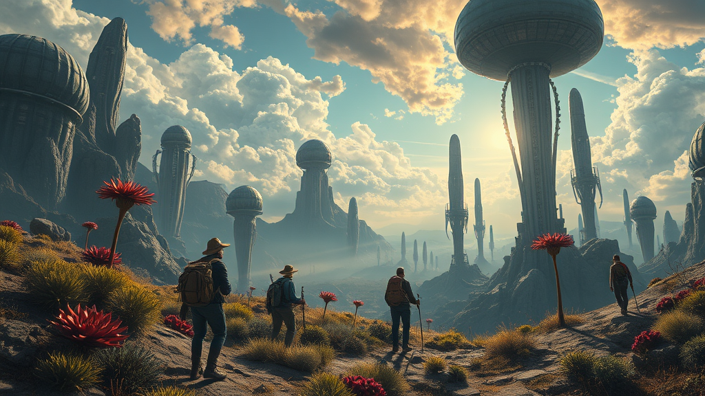 Adventurers traverse an alien landscape, an intricate sci-fi masterpiece capturing rich atmospheric detail, rendered in 4k resolution. Inspired by the works of Gris Grimly, Richard Anderson, Donato Giancola, Larry Elmore, and Josephine Wall, the scene showcases surreal flora and towering alien structures under a dynamic sky, evoking a sense of wonder and exploration.
