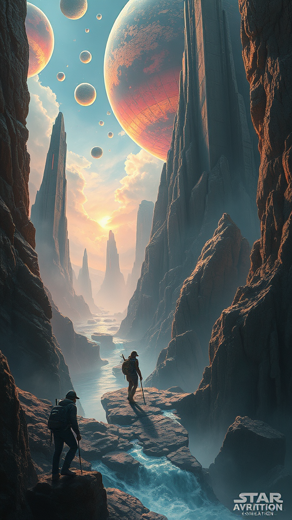 Adventurers traverse an enigmatic realm, a stunning sci-fi masterpiece with atmospheric depth, intricately detailed in 4k resolution, capturing the essence of exploration and wonder. This scene is trending on ArtStation, resembling the evocative matte paintings of Gris Grimly, Richard Anderson, Donato Giancola, Larry Elmore, and Josephine Wall, infused with imaginative embellishments of futuristic landscapes and ethereal skies. The world is alive with vibrant hues and surreal elements, pushing the boundaries of creativity and inspiring awe.