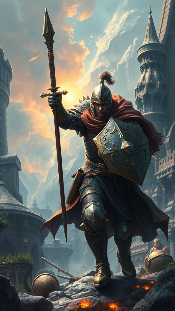 Adventurous knight on a quest| medieval fantasy setting| digital art style| elaborate details| masterpiece creation| highly detailed illustration| RPG theme| cinematic lighting effects| rich medieval atmosphere